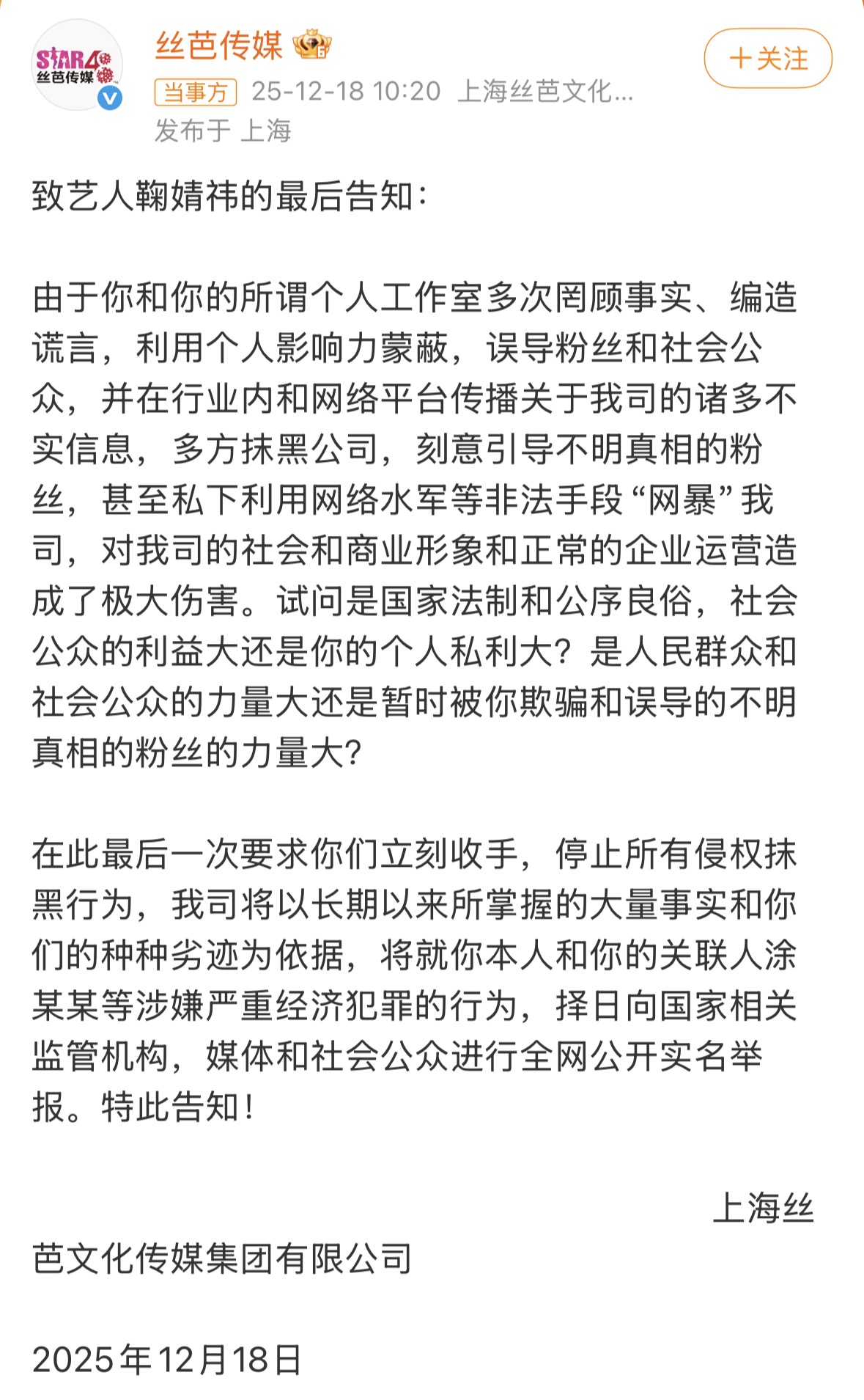 近日,艺人鞠婧祎与丝芭传媒就合约、收入等问题产生矛盾,双方纠纷持续在网络引发热议。12月18日,丝芭传媒发布“最后告知”,声称将就鞠婧祎“涉嫌严重经济犯罪的行为”向全网实名举报,让原本的民事纠纷陡然变成了刑事指控。律师认为:此“最后告知”是一份对外公开的舆论施压型告知函,并不构成合法意义上的举报。目前鞠婧祎方暂未对此做出回应。