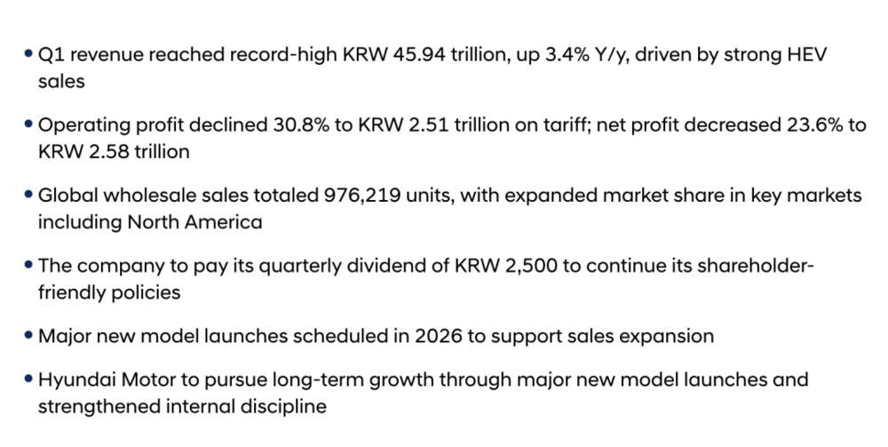 现代汽车在2026年第一季度总营收为得45.94万亿韩元(约合310亿美元),同比上升3.4%,刷新了公司历史同期记录。