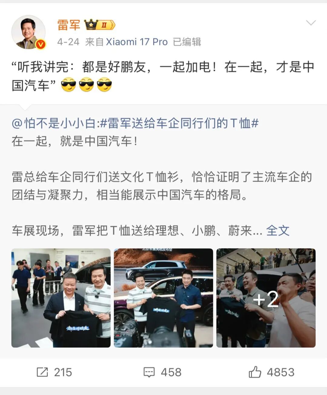 当晚,雷军还将四句话串成一条微博:“听我讲完:都是好鹏友,一起加电!在一起,才是中国汽车!”